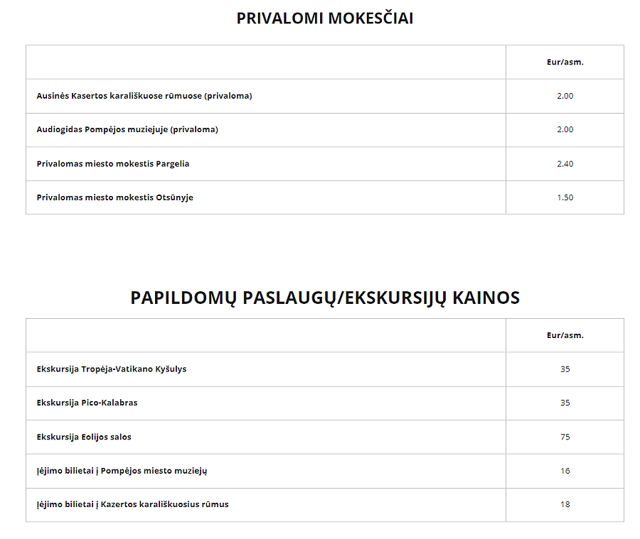 - *pažymėtos ekskursijos ar apsilankymas objektuose yra už papildomą mokestį