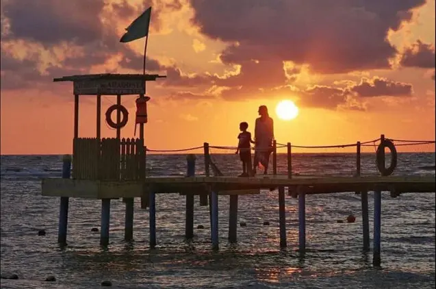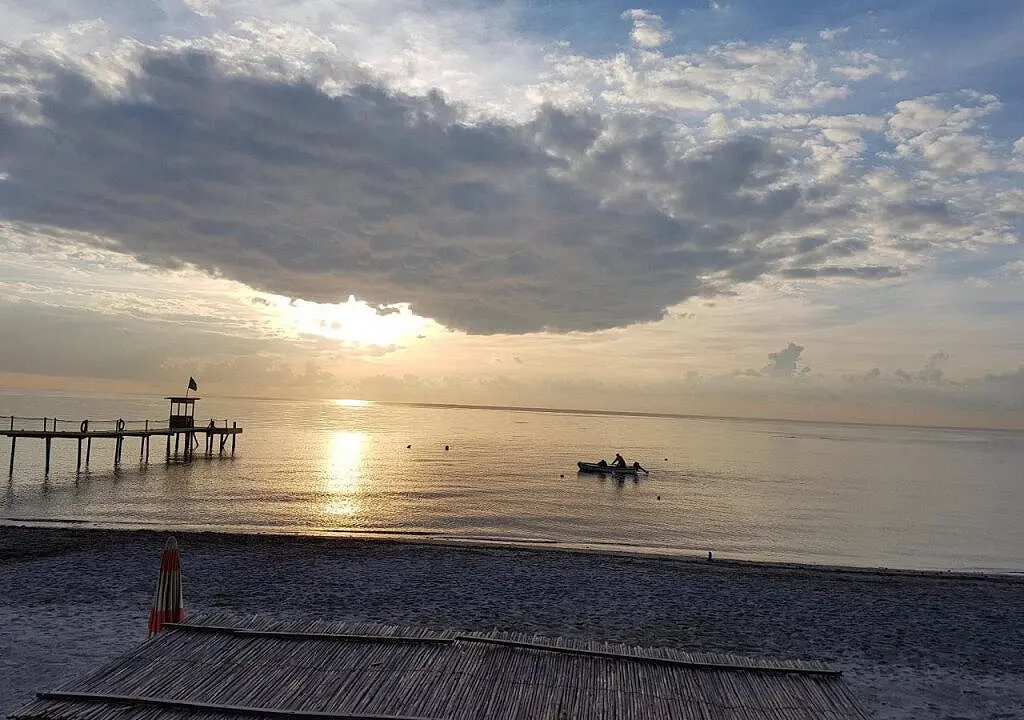 - Yra privatus paplūdimys su įrengtais skėčiais ir gultais.