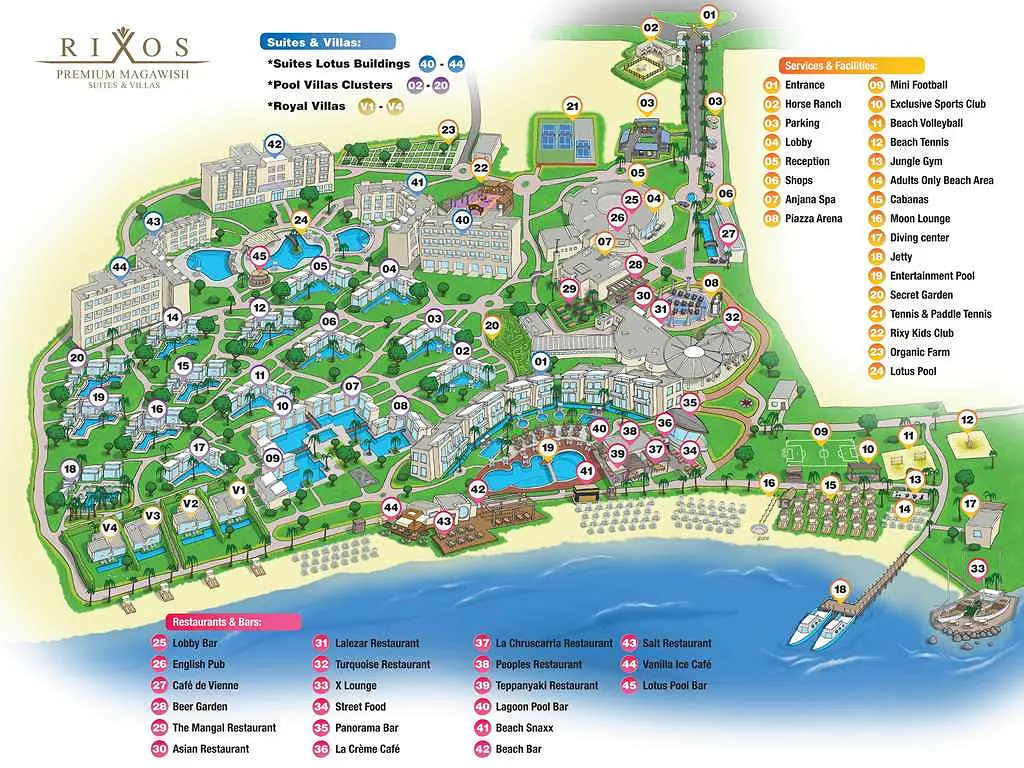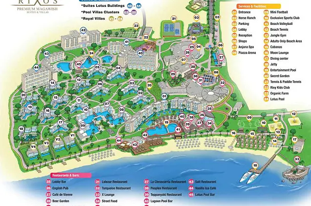 Rixos Premium Magawish Suites & Villas prabangus, aukščiausios klasės poilsio kompleksas Hurgadoje su ultra viskas įskaičiuota sistema. Komplekse įrengti tik liukso numeriai ir vilos. Paplūdimio pusėje esanti apgyvendinimo įstaiga užima 255 000 kv. m ploto teritoriją. Čia driekiasi 1 km ilgio privatus smėlio paplūdimys, yra 30 baseinų (9 tipų), pagrindinis savitarnos restoranas, 5 restoranai, kuriuose patiekalai siūlomi iš valgiaraščių, ir 10 barų, o visose patalpose veikia belaidis internetas. Šiame 5 žvaigždučių viešbutyje pageidaujantys svečiai gali naudotis privačiame paplūdimyje ir prie baseinų įrengtomis pavėsinėmis.