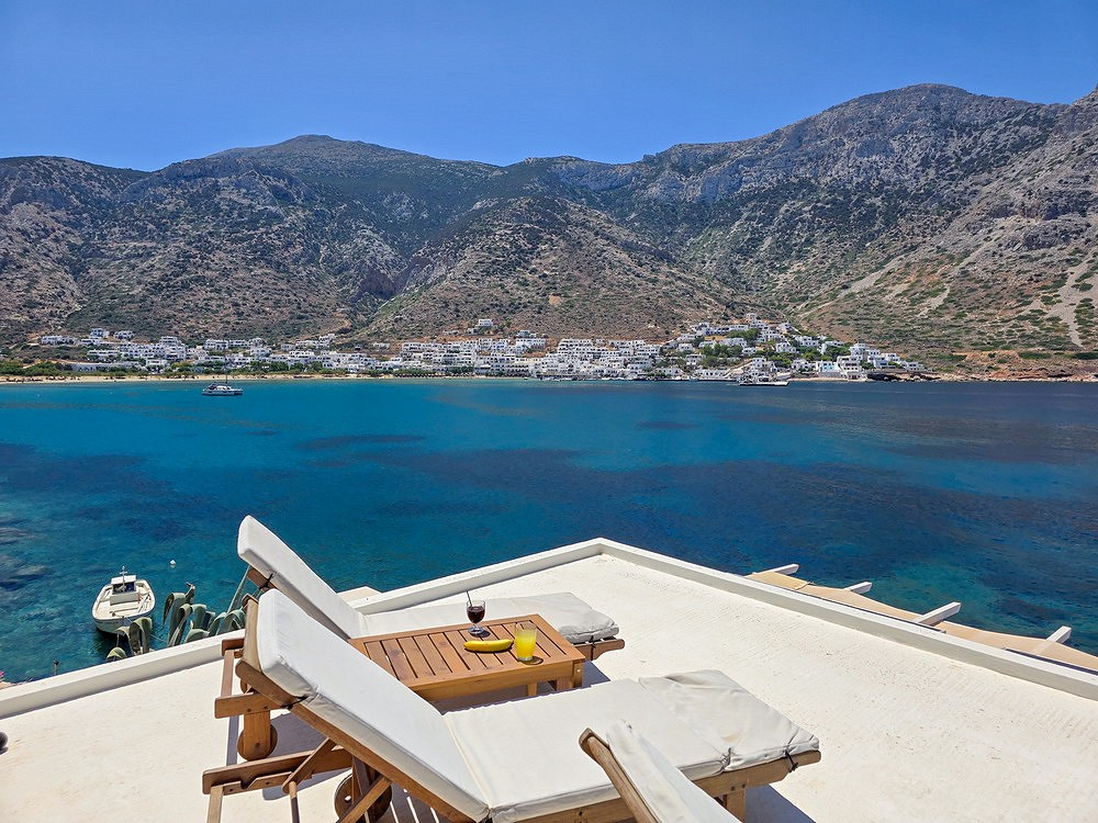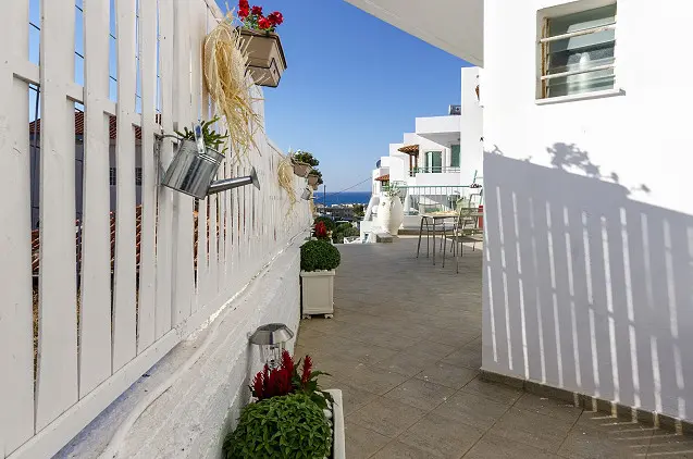 Terasa su vaizdu į saulę, šalia paplūdimio, baseino patogumai.