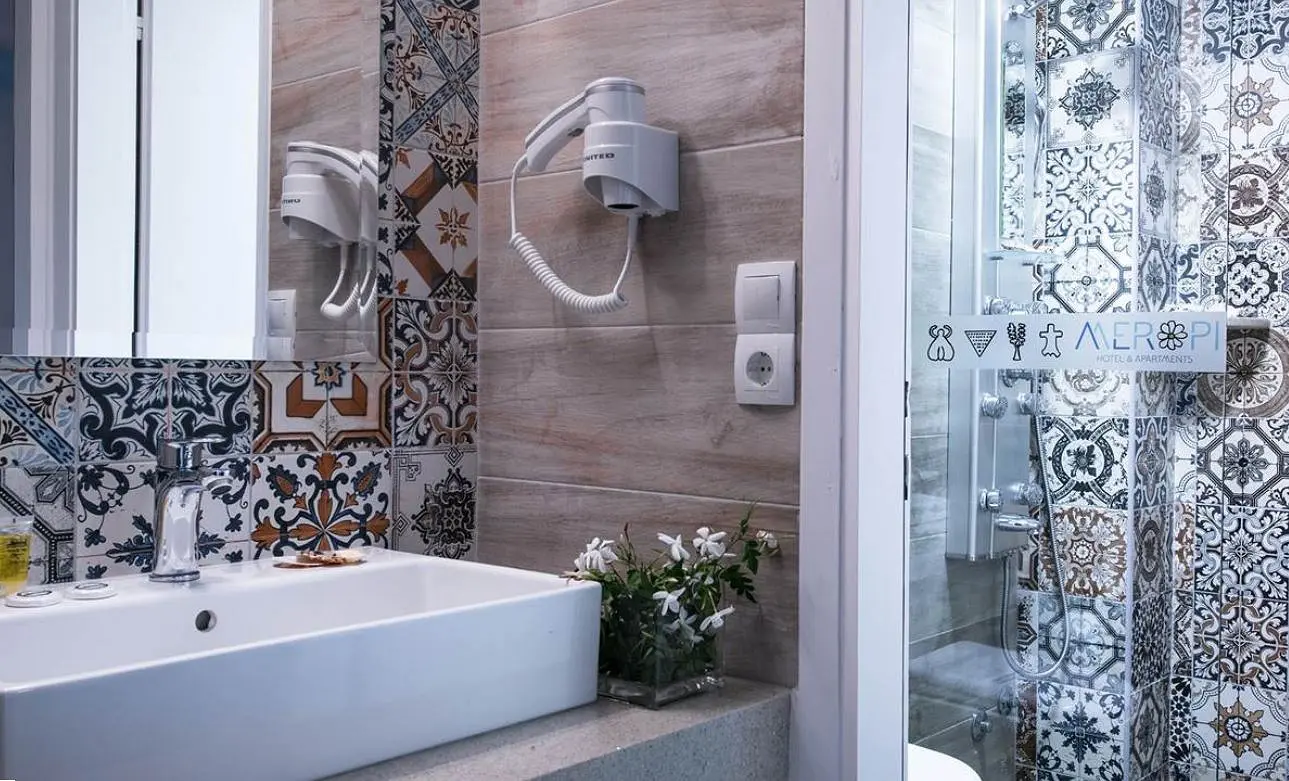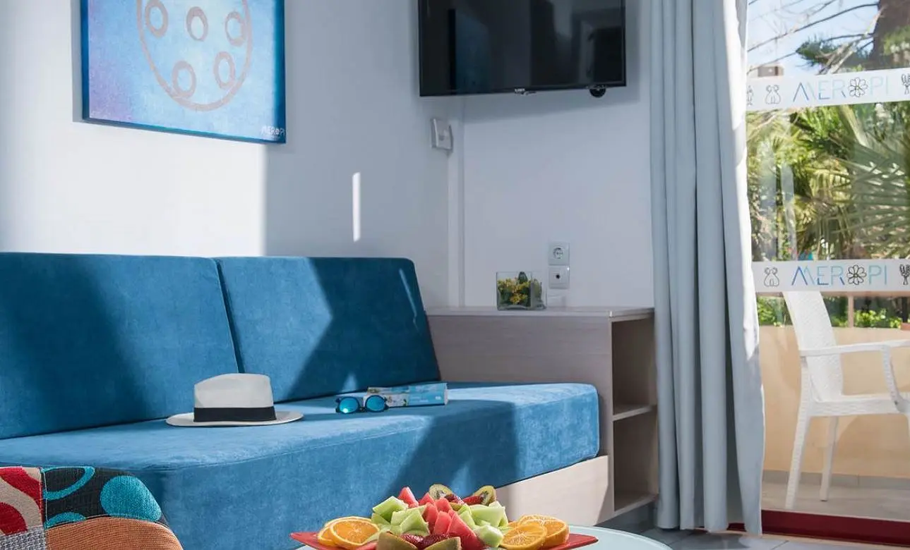 Visuose erdviuose „Meropi“ apartamentuose yra virtuvėlės, kuriose pastatyti šaldytuvai ir mikrobangų krosnelės bei įrengtos valgomojo erdvės. Šviesių spalvų numeriuose, į kuriuos patenka daug natūralios šviesos, rasite svetainės erdves su palydovinius kanalus rodančiais LCD televizoriais.