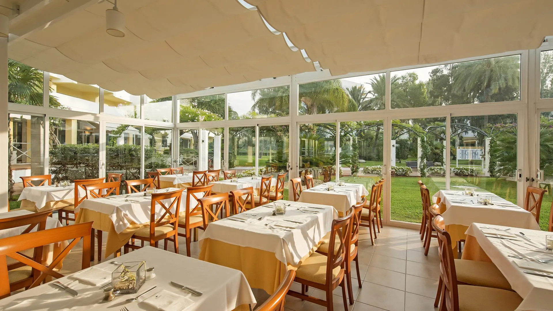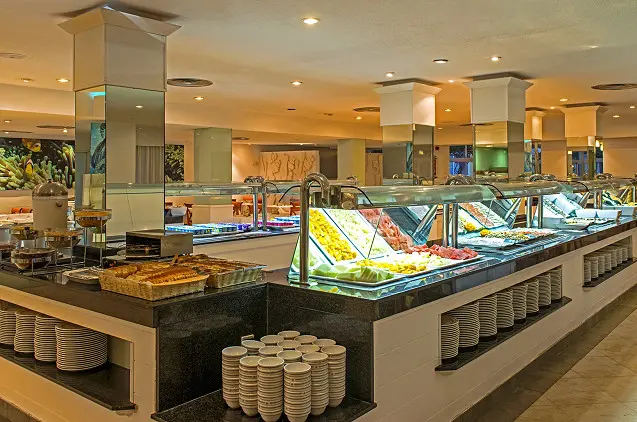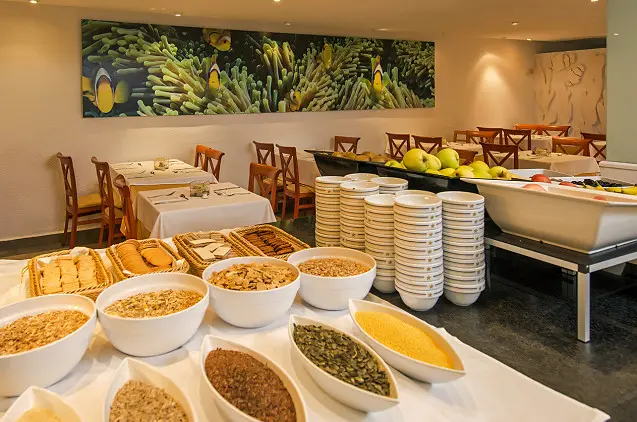 Erdviame viešbučio restorane tiekiami teminiai savitarnos valgiai, o prie baseino veikia užkandinė.
