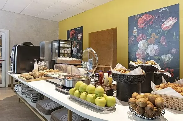 Erdviame valgomajame kasdien patiekiami įvairūs savitarnos pusryčiai.