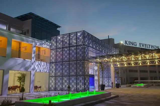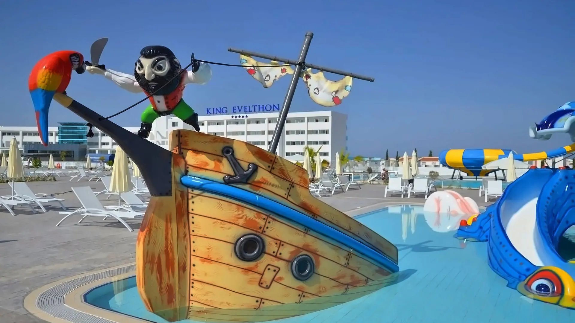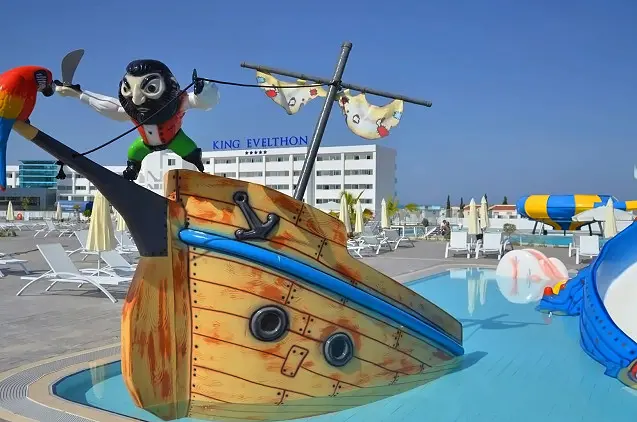 Pafe, paplūdimio pusėje, įsikūrusiame poilsio komplekse „King Evelthon Beach Hotel & Resort“ yra lauko ir vidaus baseinai, keletas barų bei restoranų ir įrengti skoningo interjero numeriai su oro kondicionieriais. Į kainą įskaičiuotas lankymasis SPA centre ir vandens parke.