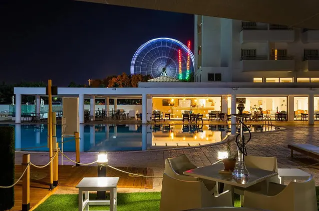 Viešbučio svečiams siūlomi įvairūs savitarnos ir iš valgiaraščio pasirenkami valgiai viešbučio restoranuose bei galimybė mėgautis gėrimais prie baseino.