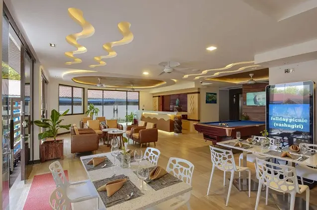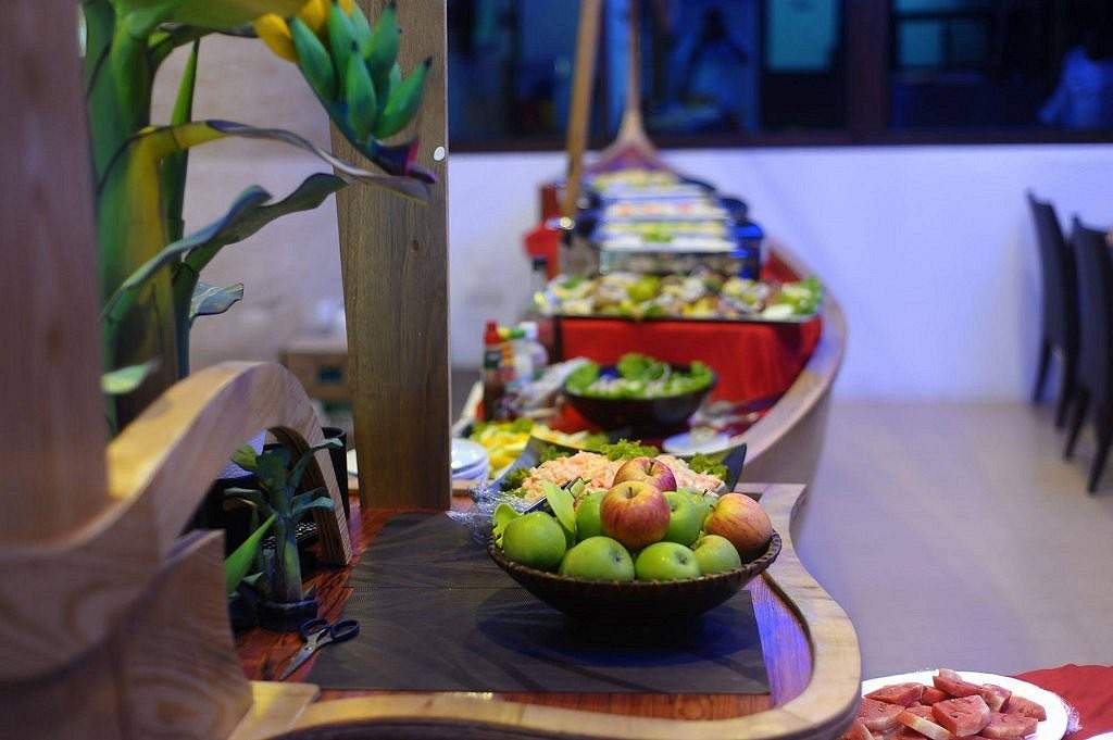 Smėlio paplūdimyje įrengtame viešbučio restorane ruošiami gardūs vietiniai ir vakarietiški valgiai, kuriais galėsite mėgautis grožėdamiesi žydra lagūna.
