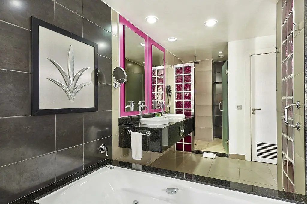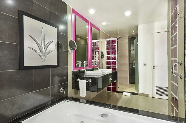 - Viešbutis išsiskiria violetinės spalvos akcentais bei moderniu minimalistiniu stiliumi.