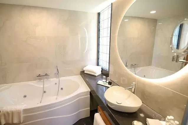 - Svečių kambariuose yra balkonai su vaizdu į sodą ir jūrą, o geresniuosiuose kambariuose yra atskiros sūkurinės vonios.